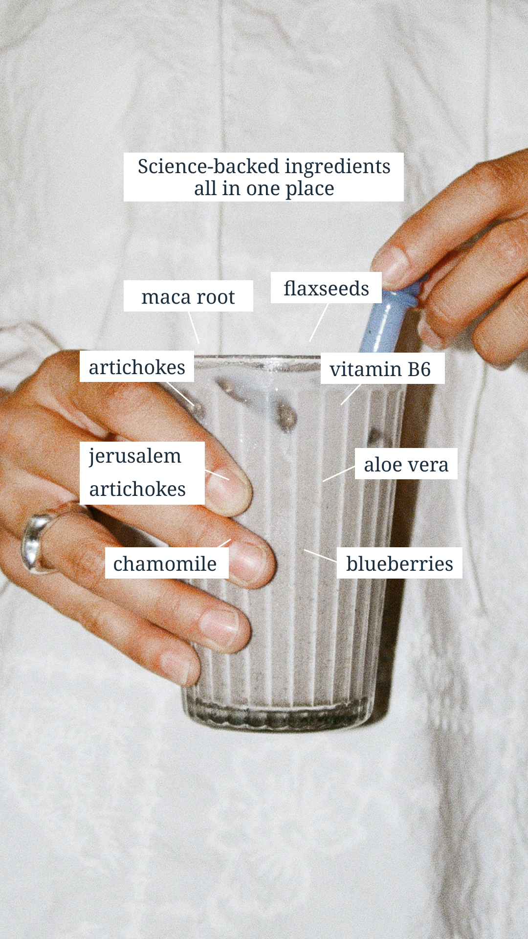 We based the blend on flaxseeds — providing fiber and lignans, which are important for hormonal activity and mood. Joining them are broccoli, artichoke, and aloe vera — a trio especially significant for comprehensive hormone support.
