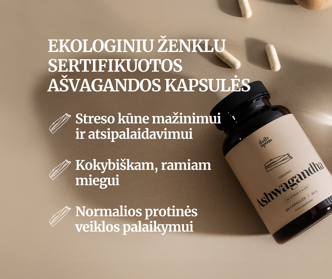 90 ašvagandos kapsulių atsipalaidavimui ir streso kūne sušvelninimui.