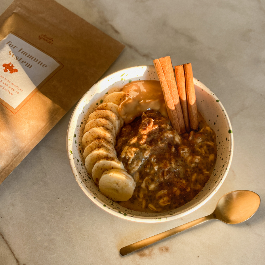 Karamelinė chai latte, praturtinta reishi adaptogenais imuninės sistemos stiprinimui