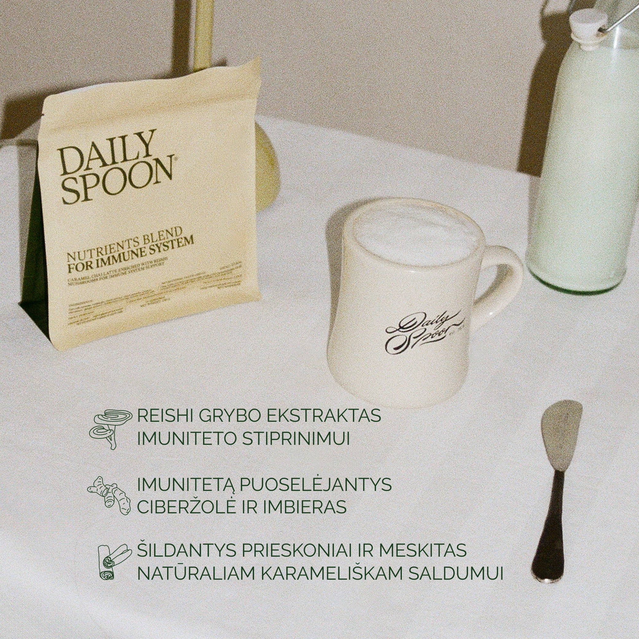 Mišinys leidžia vienu lattės puodeliu dienoje gauti visą glėbį imunitetą puoselėjančių ingredientų – imbierą, ciberžolę ir šimtmečius dėl raminamųjų savybių ir imuniteto stiprinimo tituluojamą reishi grybą.