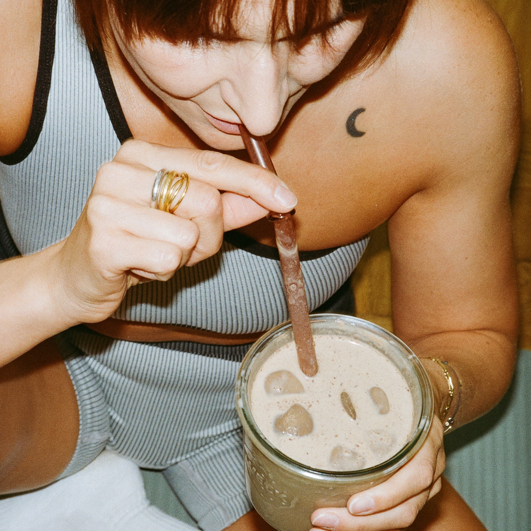 Šokolado skonį suteikia natūrali kakava, turtinga magniu ir geležimi. Pastarieji svarbūs nuovargio mažinimui ir normaliai energinių medžiagų apykaitai. Be to, mišinyje puikuojasi ir matcha – atkeliavusi iš Japonijos ir skaičiuojanti tūkstančius metų kaip suteikianti tolygios energijos.